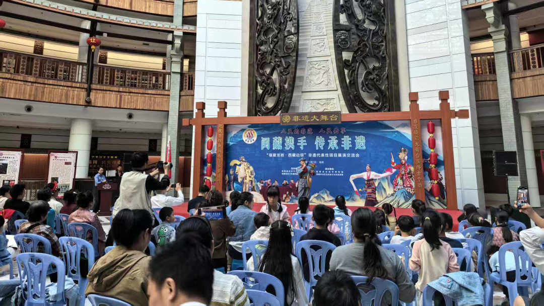 活动现场精彩纷呈,龙岩剪纸精巧灵动、客家木偶戏的活灵活现,与边坝锅庄的热情奔放、格萨尔说唱的古朴厚重轮番登台,赢得现场观众阵阵掌声。