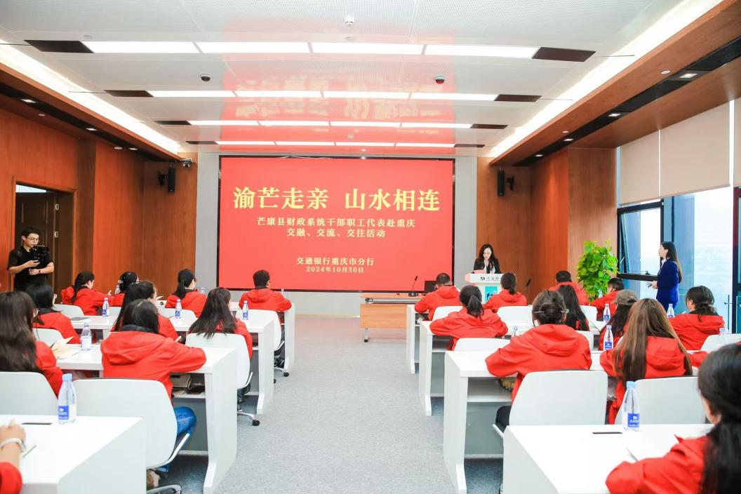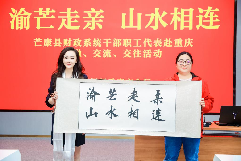 活动中,芒康县财政系统干部职工一行听取了习近平经济思想专题讲座,走进了交通银行重庆市分行行史馆,与交通银行重庆市分行党委书记、行长樊晓江及交通银行重庆市分行职工进行了深入交流,赠送了“渝芒走亲 山水相连”书法卷轴。